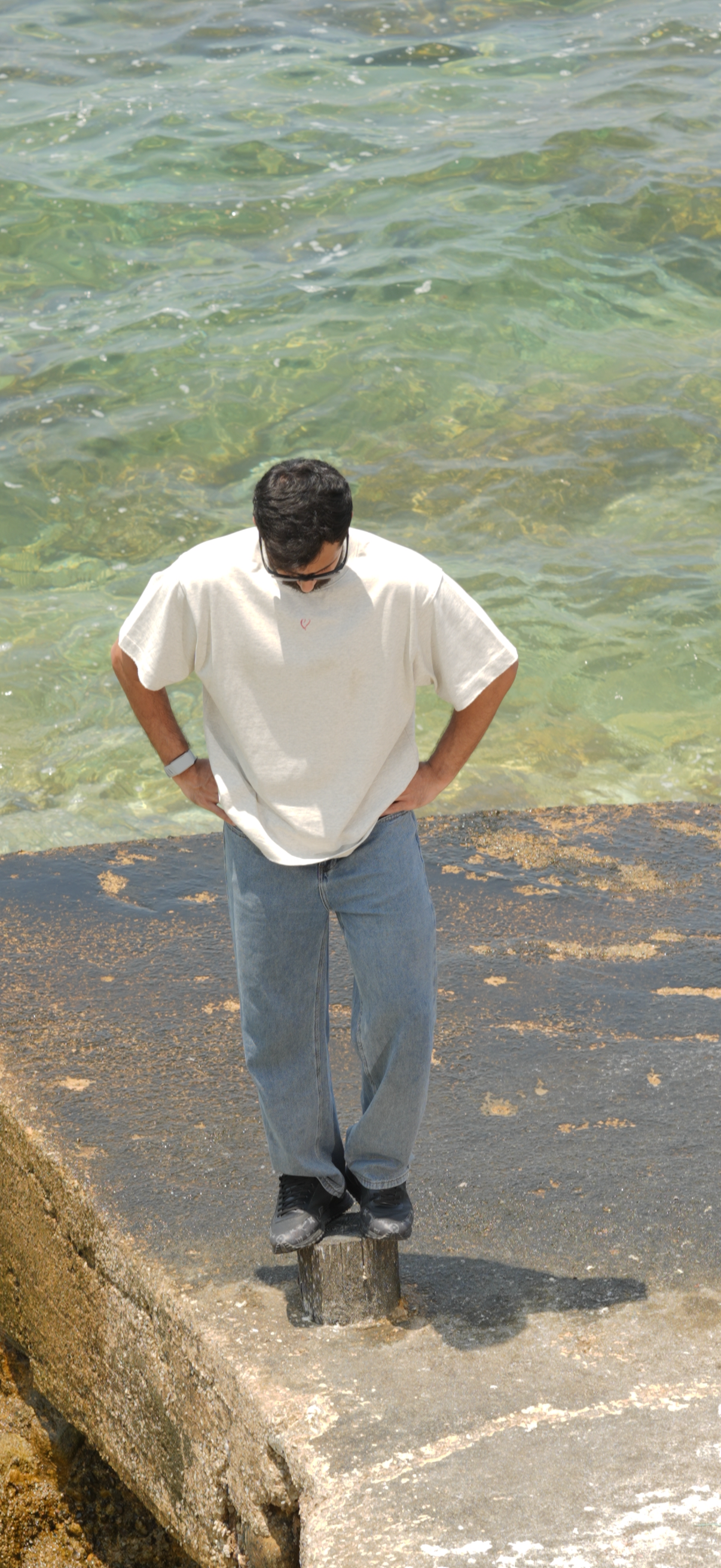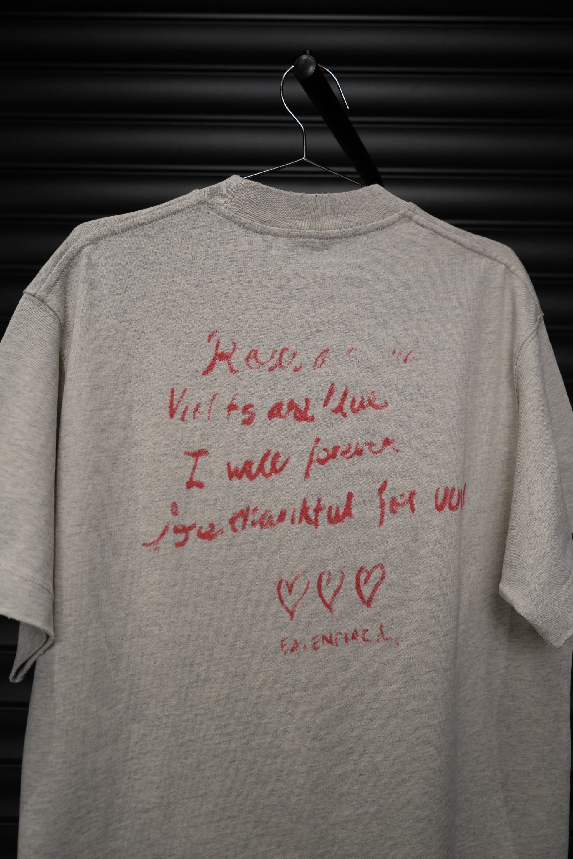 Express subtle emotion with the Written Heart Tee. Crafted from soft, breathable cotton in a light heather grey tone, this oversized T-shirt features a minimalist embroidered heart on the front and a handwritten-style message on the back in bold red ink. The message reads: